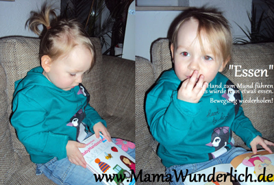 Zoe-Sophie hingegen LIEBT die Bücher, die wundervoll illustrierten Zeichnungen und auch die Gebärden. Zoes liebstes Zeichen ist „MEHR“ !!! *haha* Wenn wir z.B. nicht darauf reagieren das sie von irgendetwas mehr will, – mehr zu essen, nochmal Grüffelo anschauen oder oder oder – dann macht sie einfach das „Mehr-Zeichen“ zusätzlich. Ganz schön schlau! ;-)[su_spacer size=“20″ class=““]