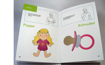 Des öfteren braucht ein Baby zur Beruhigung seinen Schnuller oder seine Lieblingspuppe, somit dürfen auch diese Zeichen im Bilderbuch der BabyHandzeichen nicht fehlen.